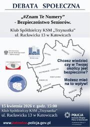 Policjanci z Komisariatu Policji V w Katowicach zapraszają na debatę społeczną pod nazwą „#Znam Te Numery — Bezpieczeństwo Seniorów". Debata odbędzie się 15 kwietnia 2026 roku o godzinie 15:00 w Klubie Spółdzielczym KSM „Trzynastka” przy ul. Racławickiej 13 w Katowicach. Serdecznie zapraszamy.