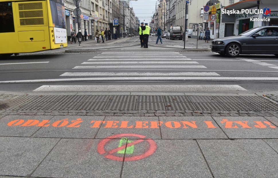 W celu poprawy bezpieczeństwa pieszych Komenda Miejska Policji w Katowicach wraz z Urzędem Miasta Katowice rozpoczęła akcję profilaktyczną „Odłóż telefon i żyj!”. W minionym tygodniu na ulicach Katowic przy przejściach, gdzie odbywa się największy ruch pieszych, pojawiły się napisy apelujące o odłożenie na chwilę swojego telefonu i rozejrzenie się czy bezpiecznie można przejść na drugą stronę. Właśnie ta dość błaha czynność może uratować nam życie. Już w najbliższy wtorek 3 grudni katowiccy policjanci przeprowadzą działania profilaktyczne w ramach akcji „Odłóż telefon i żyj!” Mundurowi w rejonie przejść, gdzie odbywa się największy ruch pieszych, będą apelować do przechodniów o to, by odłożyli swoje smartfony na chwilę do kieszeni i rozejrzeli się czy przejście przez drogę jest bezpieczne.