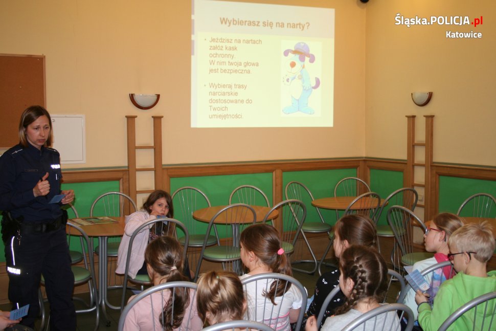 W Katowicach szereg placówek oświatowych i ośrodków sportowych realizuje akcję „Zima w mieście 2020”, wszystko po to, aby dzieci i młodzież w czasie wolnym od zajęć lekcyjnych mogła w atrakcyjny sposób spędzić ferie zimowe. Katowicka policjantka na zaproszenie Miejskiego Domu Kultury „Bogucice -Zawodzie” spotkała się z uczestnikami warsztatów artystycznych, żeby porozmawiać z nimi o bezpieczeństwie podczas zimowego wypoczynku. Mł.asp. Agnieszka Krzysztofik z pomocą maskotki śląskiej Policji Sznupkiem – omówiła jak należy bezpiecznie bawić się na śniegu, jeździć na sankach, łyżwach i nartach, a także jak należy zachować się w trudnych sytuacjach np. gdy jest się świadkiem wypadku. Wtedy ważne jest niezwłoczne powiadomienie o zdarzeniu osoby dorosłej oraz powiadomienie odpowiednich służb ratunkowych dzwoniąc na numer alarmowy 112. Ponadto policjantka zapoznała uczestników z dekalogiem Międzynarodowej Federacji Narciarskiej (FIS) oraz zorganizowała konkurs z nagrodami. Dwie grupy dzielnie walczyły, wykonując różne zadania, m.in. układając puzzle o tematyce policyjnej, wypełniając zimową wykreślankę oraz krzyżówkę. Drużyna, która okazała się bezkonkurencyjna, została nagrodzona kamizelkami odblaskowymi. Wszyscy uczestnicy dla zwiększenia bezpieczeństwa na drodze zostali wyposażeni również w odblaski. Dodatkowo policjanta przekazała różne materiały i gadżety o tematyce bezpiecznego wypoczynku zimowego m.in. informatory „Bezpieczna woda zimą”, „Bezpieczny stok”, dekalog Międzynarodowej Federacji Narciarskiej (FIS) oraz „Dekalog bezpiecznego narciarza misia Stramusia”.