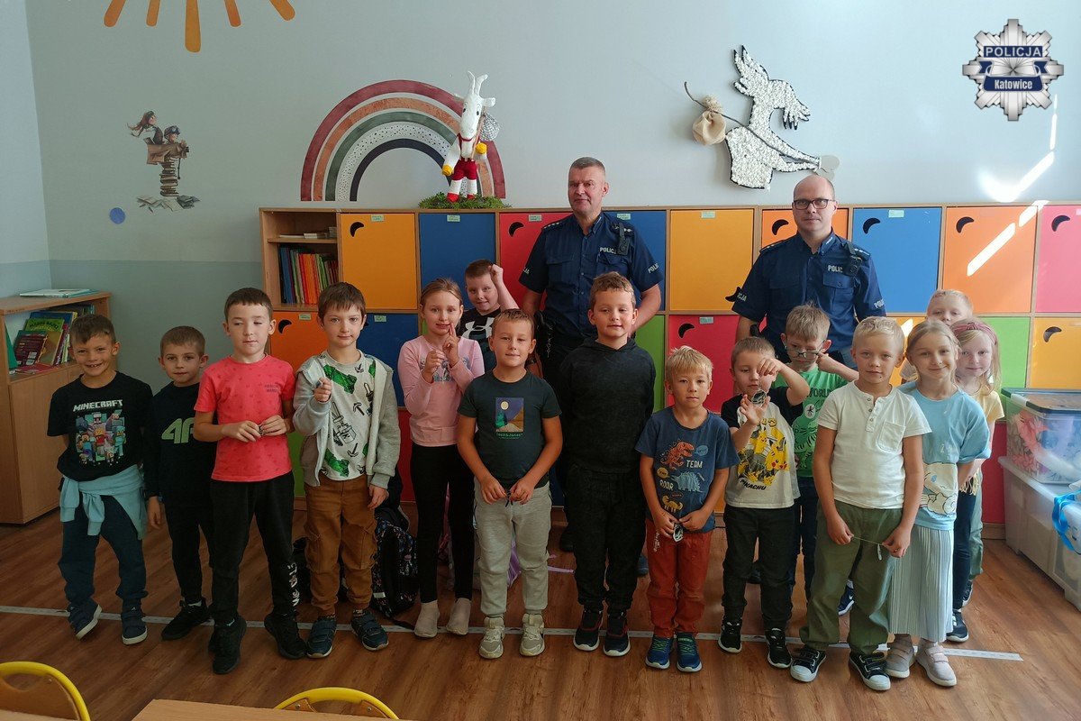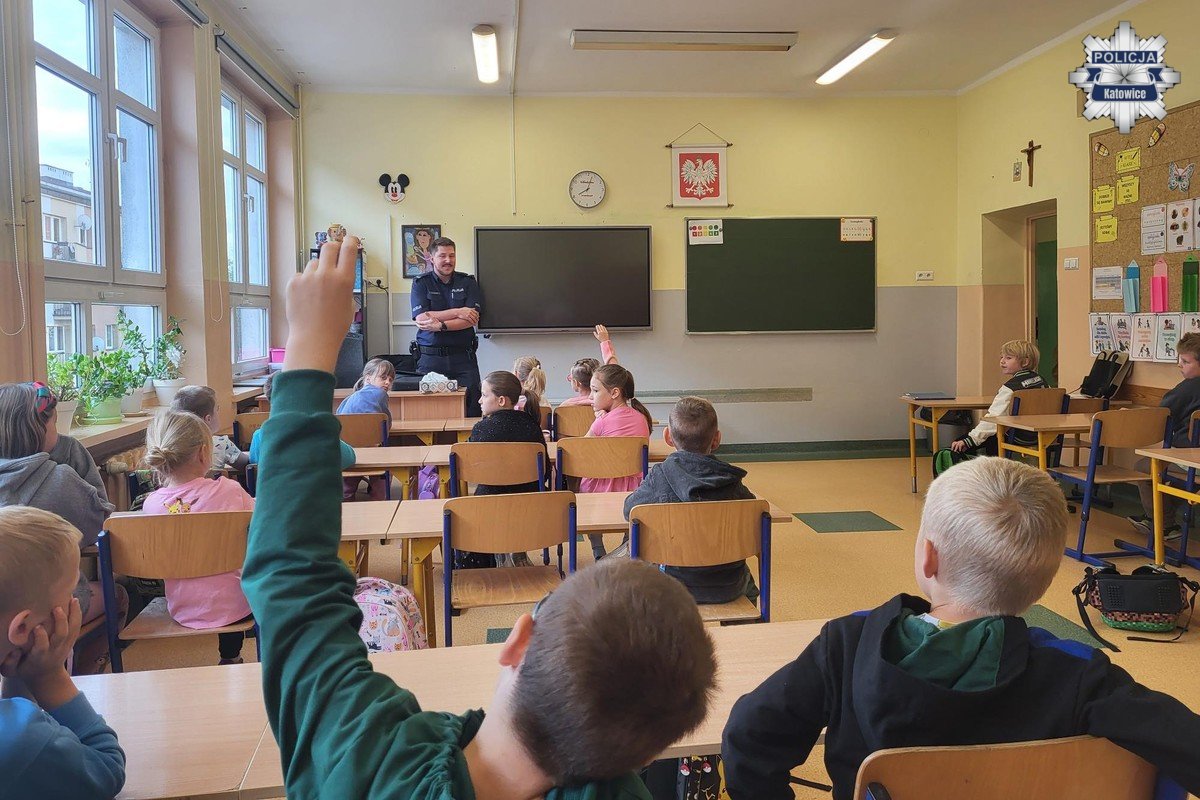 Katowiccy policjanci w ramach działań „Błyskotliwy pierwszak, czyli bezpieczna droga do szkoły” prowadzą zajęcia z pierwszoklasistami. Tym razem dzielnicowi i profilaktyk odwiedzili trzy szkoły podstawowe. Mundurowi uczyli dzieci przepisów ruchu drogowego i bezpiecznego przechodzenia przez jezdnię.