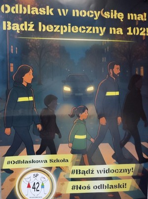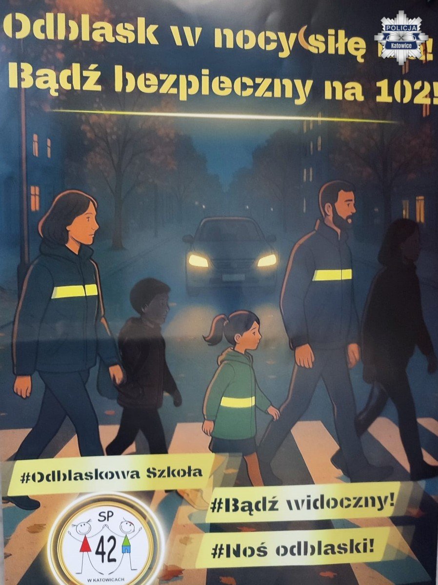 Katowicka profilaktyk st. asp. Agnieszka Krzysztofik uczestniczyła w spotkaniu zorganizowanym przez uczniów ze Szkoły Podstawowej nr 42 w Katowicach pod okiem pedagog Magdaleny Soska-Kaczmarczyk w związku z akcją profilaktyczną „Odblaskowa szkoła”. Na plakacie promującym wydarzenie pojawił się napis „Odblask w nocy siłę ma! Bądź bezpieczny na 102”. Wydarzenie było doskonałą okazją do integracji młodych osób z seniorami ze Stowarzyszenia „Mocni Razem”.