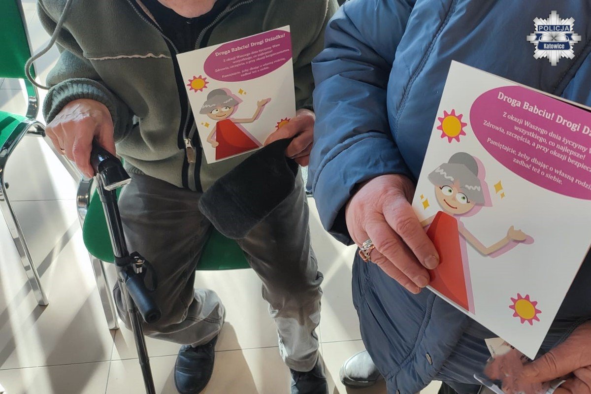 Dzień Babci i Dziadka był doskonąłą okazją, aby porozmawiać z seniorami o czyhających zagrożeniach. Oszuści nadal działają przez telefon i wyłudzają od seniorów ich oszczędności. W 2025 roku 22 katowickich seniorów utraciło oszczędności życia. Oszuści najczęściej podszywali się pod policjanta, lekarza oraz wnuczka. Katowicka policjantka wraz z dzielnicowym z Komisariatu I Policji w Katowicach podczas spotkania rozmawiała z seniorami o metodach działania oszustów, wyposażyła ich w materiały edukacyjne dotyczące bezpiecznego zachowania podczas rozmów telefonicznych, w Internecie, w domu oraz przestrzeni publicznej. Otrzymane materiały pozwolą na uniknięcie zostania ofiarą przestępstwa. Ponadto dla zwiększenia widoczności na drodze seniorzy otrzymali odblaski.