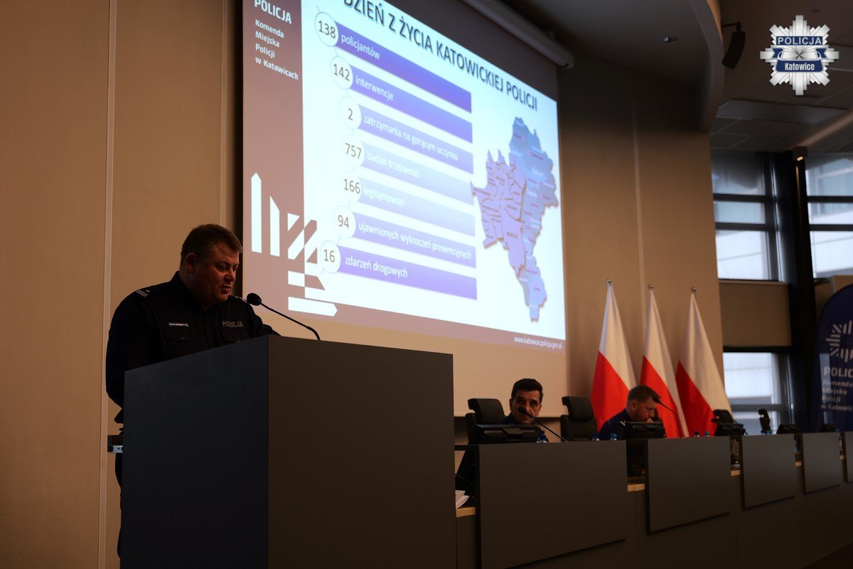 Kolejno Zastępca Komendanta Miejskiego Policji w Katowicach podinsp. Piotr Chrobok podsumował pracę służb prewencyjnych, zwracając uwagę na podejmowane działania na rzecz utrzymania bezpieczeństwa i porządku publicznego na terenie miasta.