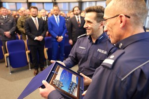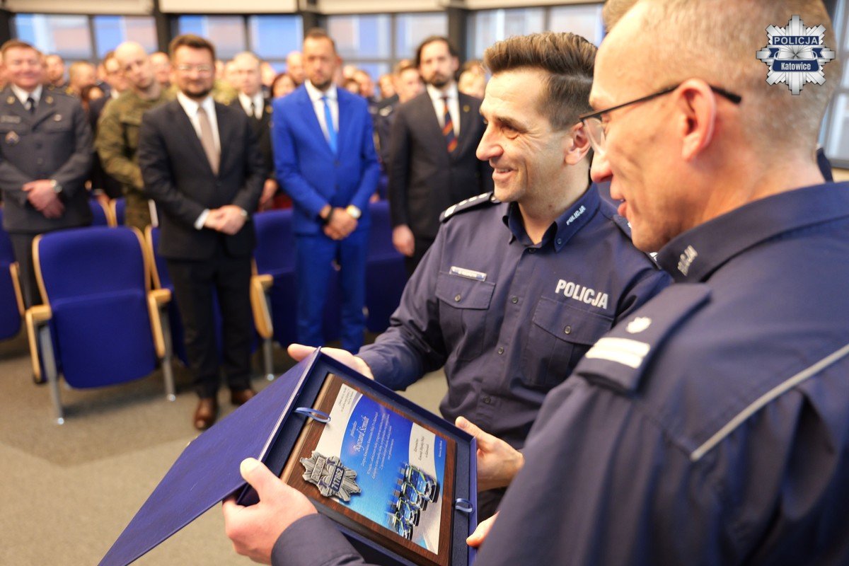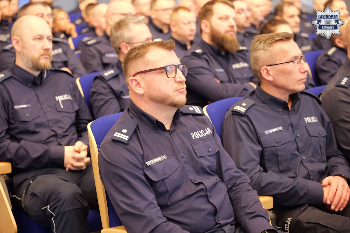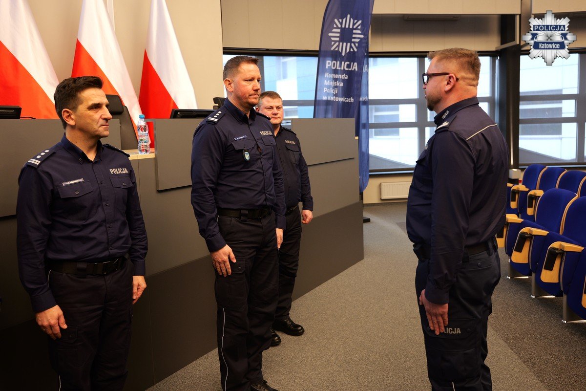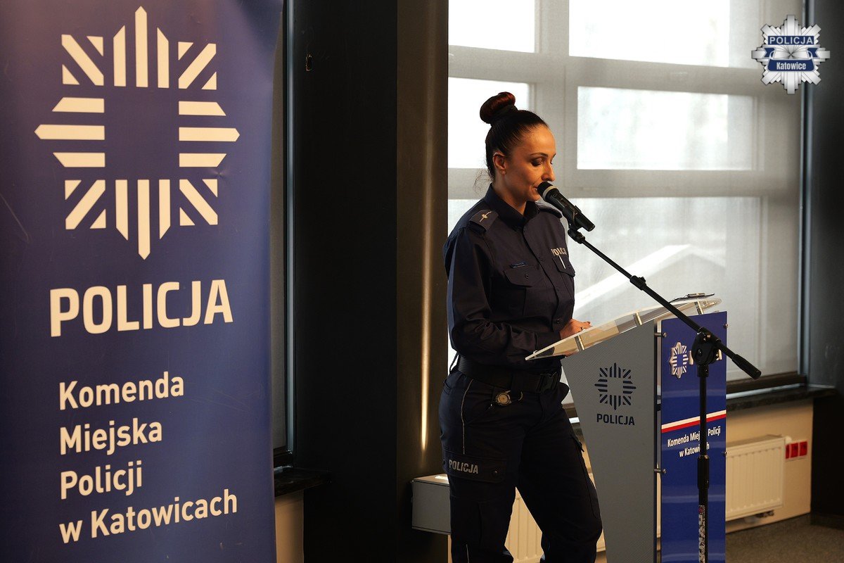 Następnie głos zabrał Prezydent Miasta Katowice dr Marcin Krupa, który wyraził uznanie dla codziennej służby policjantów oraz podziękował im za trud, profesjonalizm i zaangażowanie, zapewniając jednocześnie o dalszym wsparciu miasta dla katowickiej Policji. Słowa uznania skierował również Przewodniczący Rady Miasta Katowice Łukasz Borkowski, dziękując funkcjonariuszom za służbę na rzecz bezpieczeństwa mieszkańców największego miasta województwa śląskiego.
