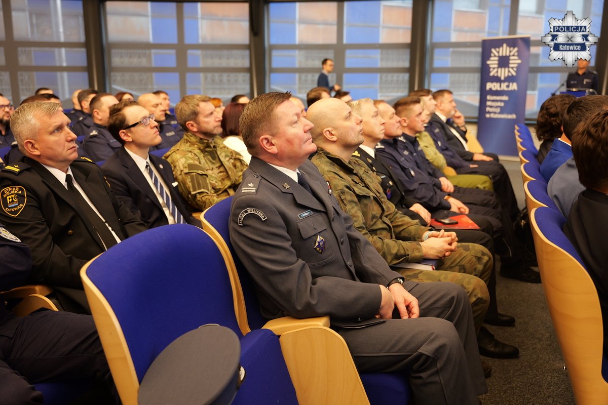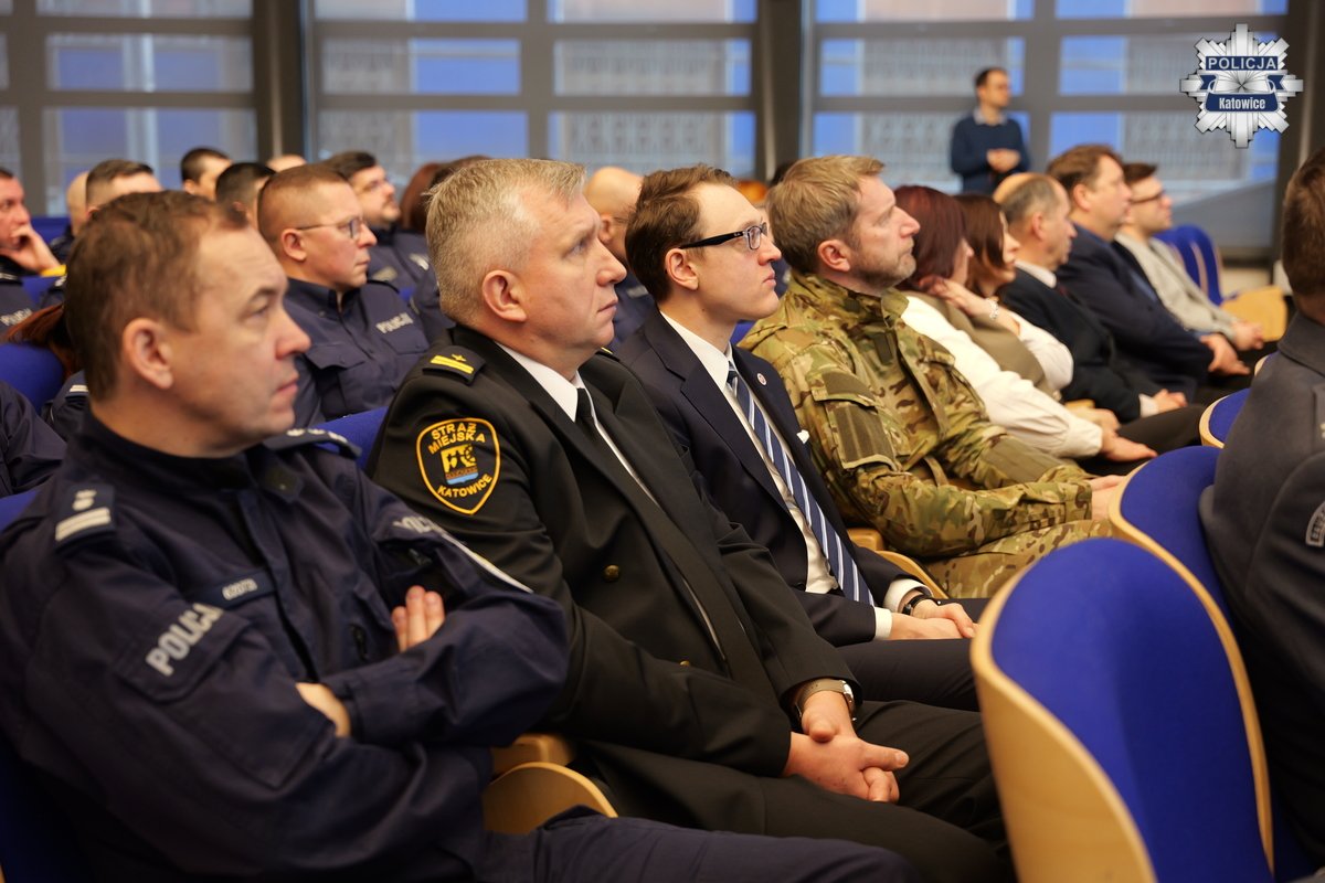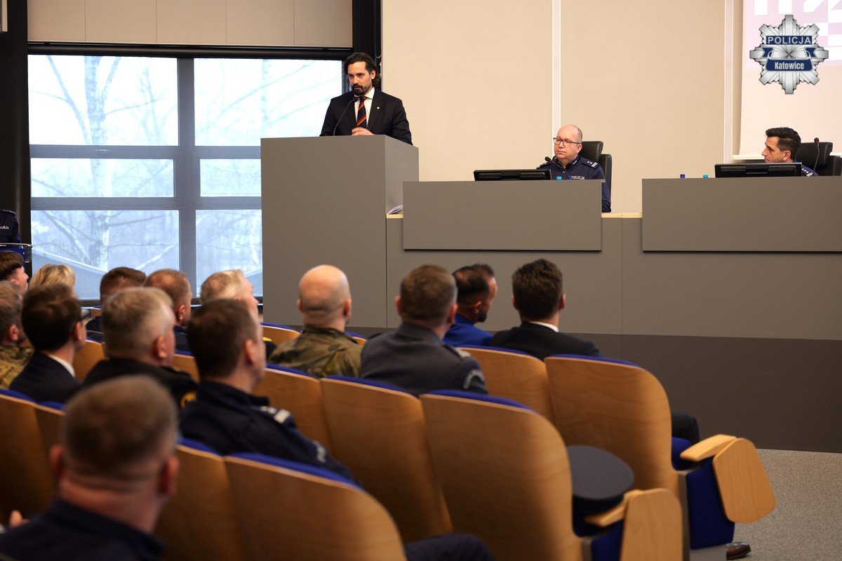 Wczoraj w auli Komendy Wojewódzkiej Policji w Katowicach odbyła się odprawa roczna podsumowująca pracę katowickich policjantów w 2025 roku. W spotkaniu udział wzięli m.in. Pierwszy Zastępca Komendanta Wojewódzkiego Policji w Katowicach insp. Radosław Kacprzak, Komendant Miejski Policji w Katowicach insp. Dariusz Kiedrzyn wraz ze swoimi zastępcami, Prezydent Miasta Katowice dr Marcin Krupa, władze miasta, przedstawiciele służb mundurowych oraz instytucji państwowych.