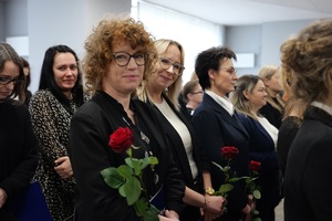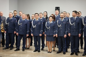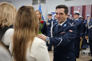 Następnie insp. Dariusz Kiedrzyn w towarzystwie Naczelnika Wydziału Kadr i Szkolenia podinsp. Sebastiana Hulina przekazał wyróżnienia pracownikom korpusu służby cywilnej, dziękując im za szczególne osiągnięcia oraz wzorowe wykonywanie obowiązków wręczając przy tym symboliczne róże.